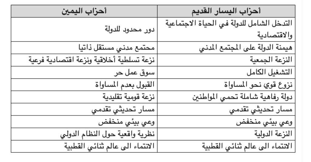 هذه هي أهم الخصائص التي ميزت ما بين أحزاب اليمين وأحزاب اليسار مع تواجد بعض الاختلافات الطفيفة بين هنا وهناك، لكن يمكن أن نجازف بالقول أن النقطتين التي تلتقي فيها أحزاب اليمين واليسار (وعي بيئي منخفض والانتماء الى عالم ثنائي القطبية) وكذا الاحتفاض بالنقط الايجابية لديهما، سوف تحفز كثيرا على طرح الأسئلة التوجيهية الكبرى من داخل الحقل السياسي بغية إعادة استرجاع زمام المبادرة من طرف الفاعل السياسي ومن بينها :