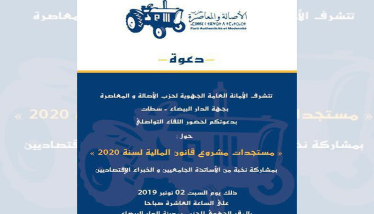 يحتضن المقر الجهوي لحزب الأصالة والمعاصرة بجهة الدار البيضاء سطات، يوم السبت 02 نونبر 2019 ابتداء من الساعة العاشرة، (يحتضن) لقاء تواصليا حول موضوع، “مستجدات مشروع قانون المالية لسنة 2020″، وذلك بتأطير نخبة من الأساتذة الجامعيين والخبراء الإقتصاديين.