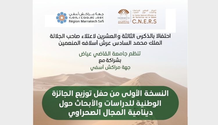 ينظم؛ مجلس جهة مراكش آسفي، بشراكة مع جامعة القاضي عياض، الدورة الأولى لحفل تتويج الفائزين بالجائزة الوطنية للدراسات والأبحاث حول ديناميات المجال الصحراوي، وذلك يوم السبت 23 يوليوز الجاري بمركز الندوات التابع للجامعة.