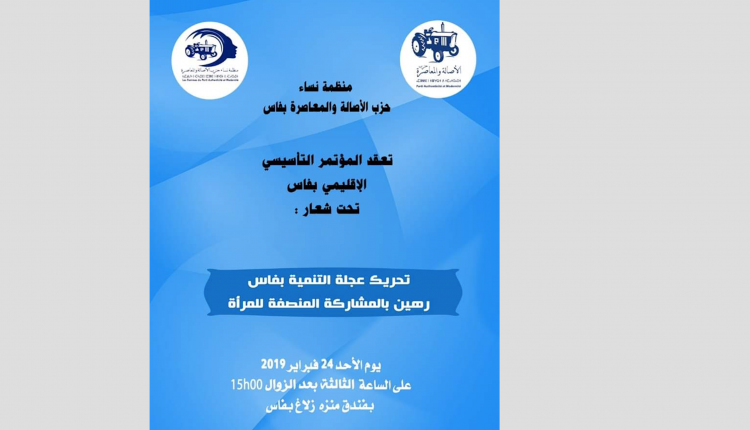 في سياق دينامية الهيكلة التنظيمية لمنظمة نساء حزب الأصالة والمعاصرة، يعقد فرع المنظمة بإقليم فاس المؤتمر التأسيسي الإقليمي، وذلك يوم الأحد 24 فبراير 2019، بفندق منزه زلاغ.
