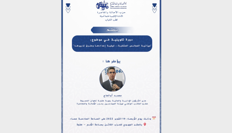ينظم؛ قطب الشباب بالأمانة الإقليمية لحزب الأصالة والمعاصرة بعمالة طنجة- أصيلة؛ دورة تكوينية في موضوع: “ميزانية المجالس المنتخبـة.. كيفية إعدادها وطرق تدبيرها”؛ يؤطرها مدير الشؤون الإدارية والمالية بمجلس جهة طنجة تطوان الحسيمة؛ السيد محمد أولحاج.