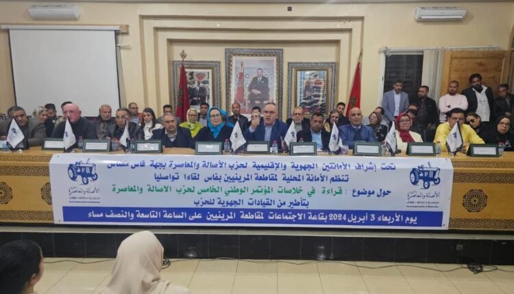 بحضور وازن لقيادات البام بجهة فاس- مكناس، وأمام حضور قوي لمناضلات ومناضلي ومنتخبي ومناصري حزب الأصالة والمعاصرة بمقاطعة المرينيين- فاس خاصة وباقي مقاطعات و جماعات وأقاليم جهة فاس- مكناس، نظمت الأمانة المحلية لمقاطعة المرينيين بفاس؛ تحت إشراف الأمانتين الإقليمية والجهوية للحزب بالجهة فاس مكناس؛ يوم الأربعاء 3 أبريل 2024، بقاعة الاجتماعات لمقاطعة المرينيين؛ لقاء تواصليا حول موضوع: “قراءة في خلاصات المؤتمر الوطني الخامس لحزب الأصالة والمعاصرة”.