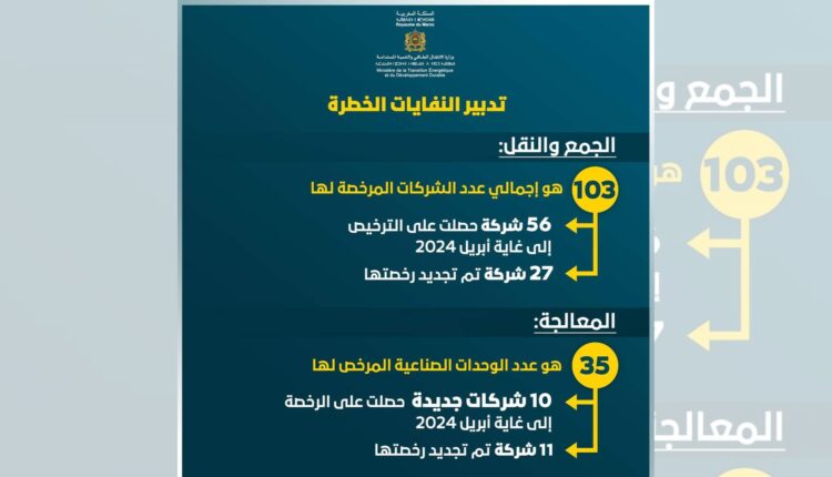 في إطار تطبيق مقتضيات المرسوم رقم 2.14.85 المتعلق بتدبير النفايات الخطرة، أفادت وزارة الإنتقال الطاقي والتنمية المستدامة، أن عدد التراخيص الجديدة لجمع ونقل النفايات الخطرة، سجل ارتفاعا ملحوظا ليصل إلى 56 شركة جديدة، إضافة إلى تجديد التراخيص لــ 27 شركة أخرى، ليصل العدد الإجمالي للشركات المرخص لها إلى 103 على الصعيد الوطني.