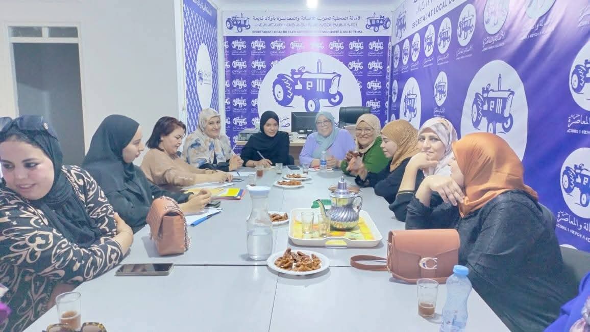 عقدت، خديجة بلا عضو مكتب منظمة نساء الأصالة والمعاصرة بجهة سوس- ماسة، يوم السبت 14 يونيو 2025 بمقر الحزب بأولاد تايمة، لقاء تواصليا للجنة المنظمة بمحلية اولاد تايمة، وذلك بحضور خديجة حافا عضوة المجلس الوطني لنساء الأصالة والمعاصرة، والسيدات أعضاء الأمانة المحلية للحزب، واللجنة المهتمة بقضايا المرأة وتمكينها.